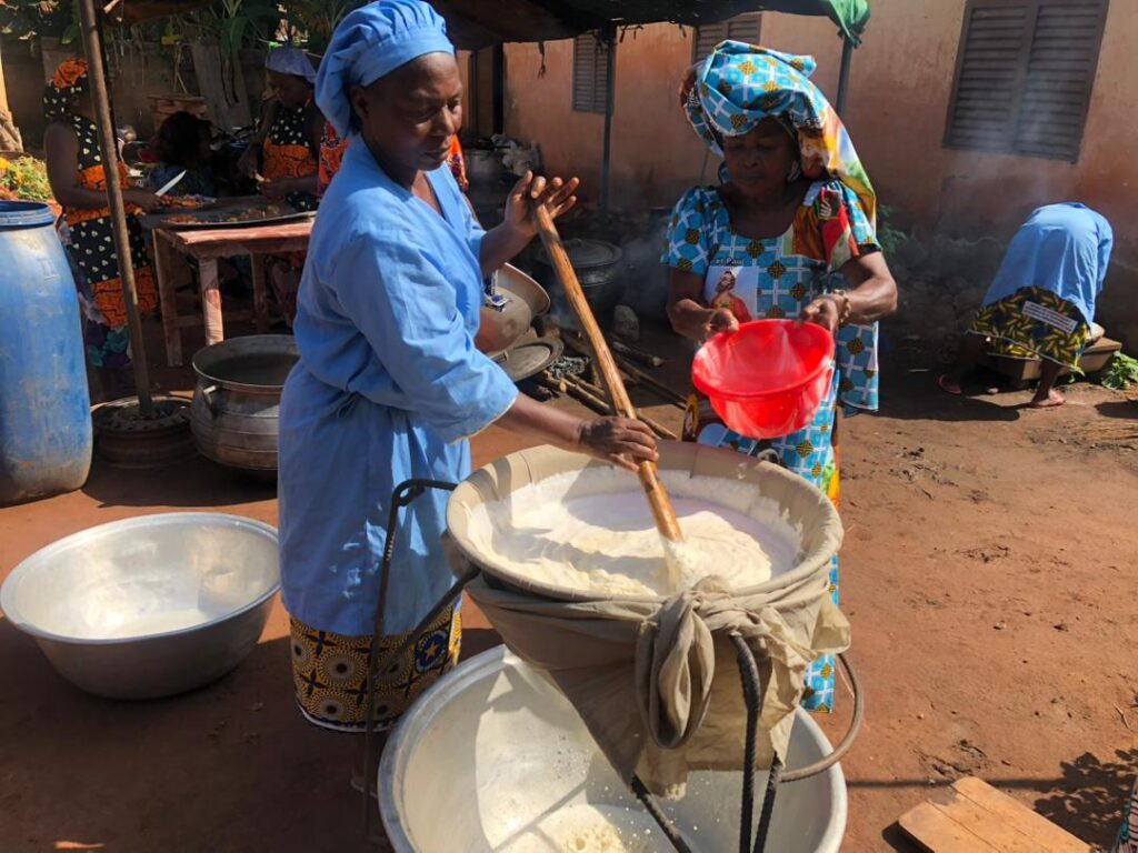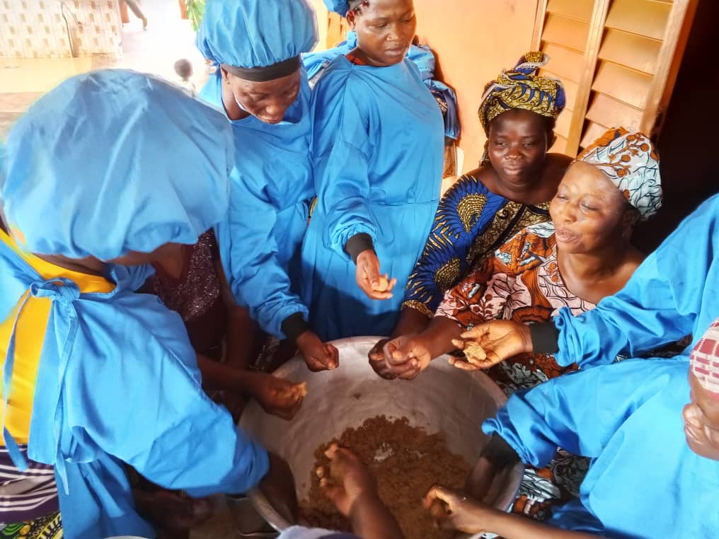 Comme à Djidja, les communes d’Abomey, Klouékanmè et Djakotomey ont accueilli des sessions pratiques centrées sur la transformation du soja et de l’arachide en produits à forte valeur ajoutée : fromage de soja, brochettes, boulettes, galettes d’arachide (Kluiklui), nougat, andou, etc.